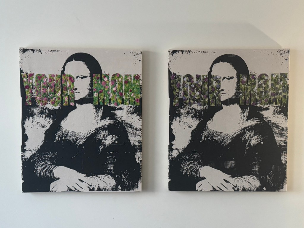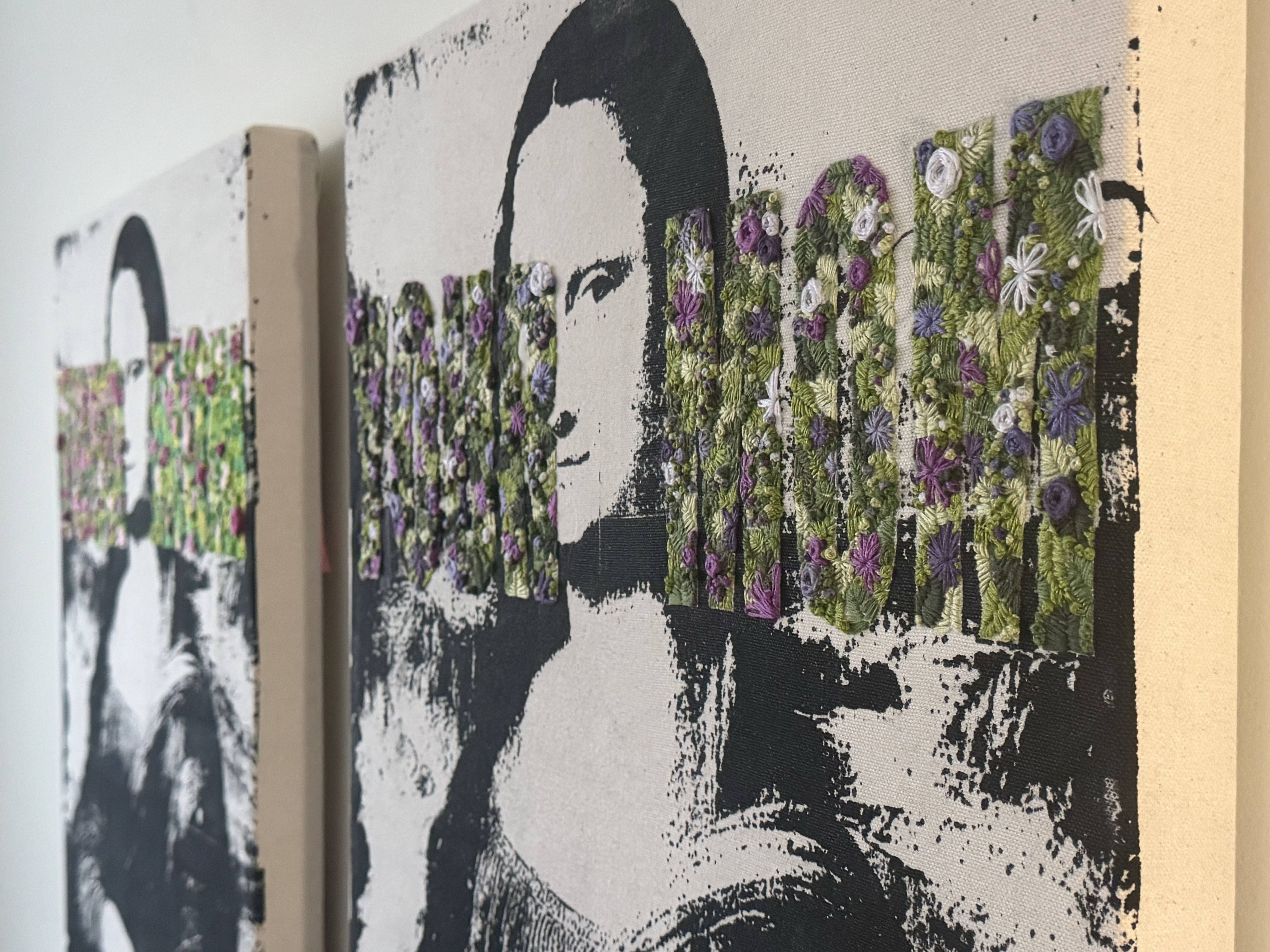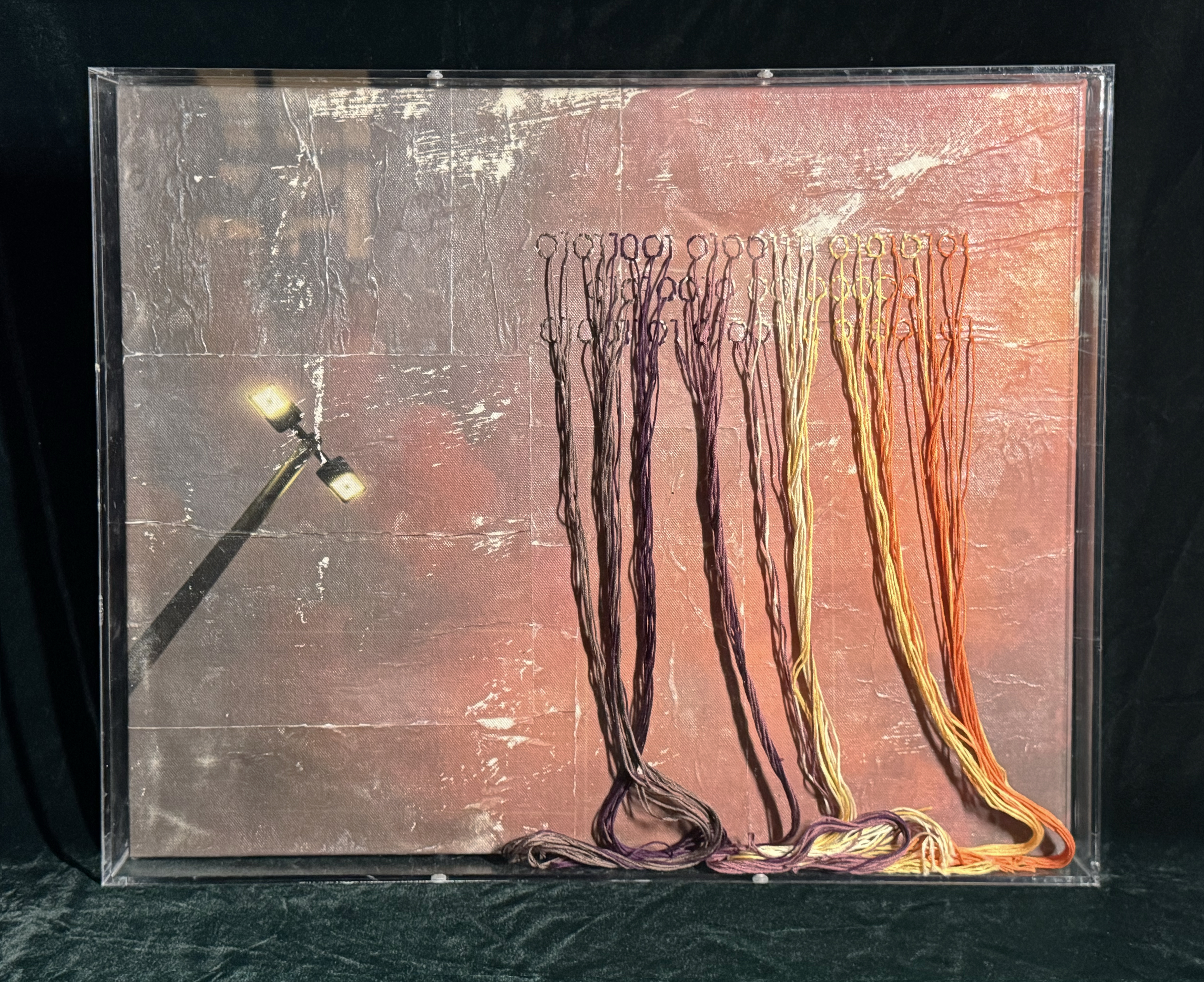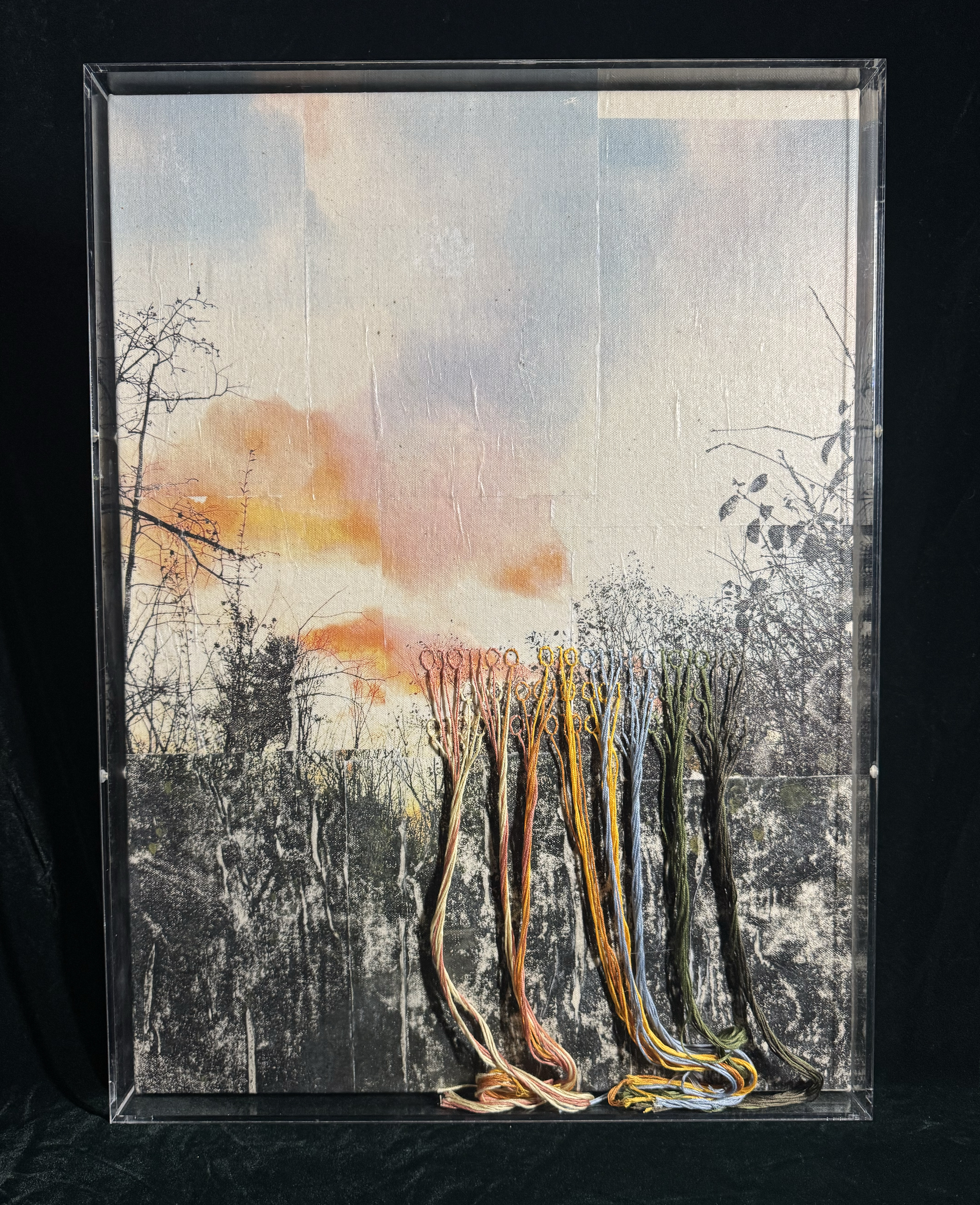 Your Mom I and Your Mom II, Gel Medium Transfer, Embroidery Floss, under Acrylic Plexi, 2025.