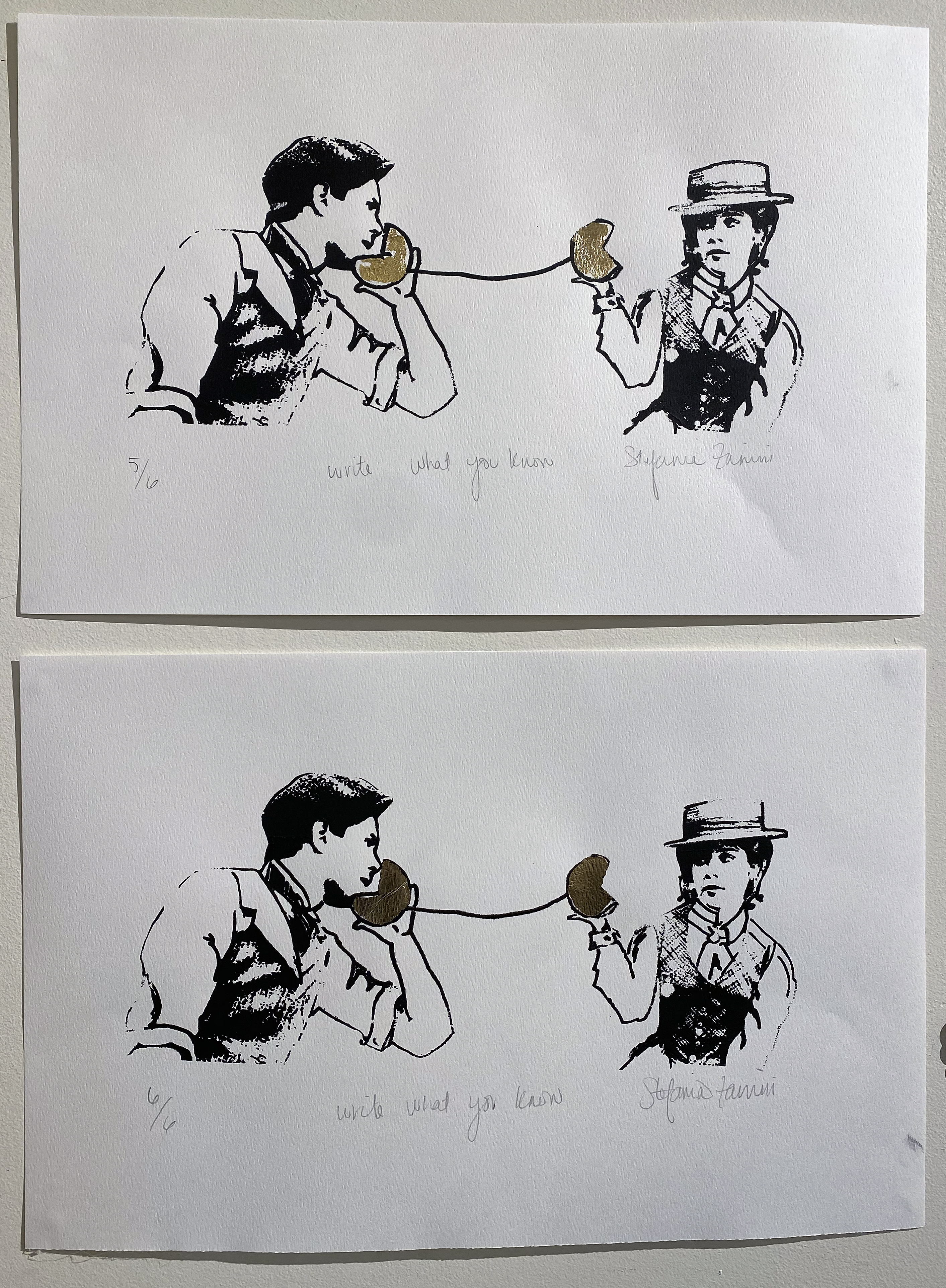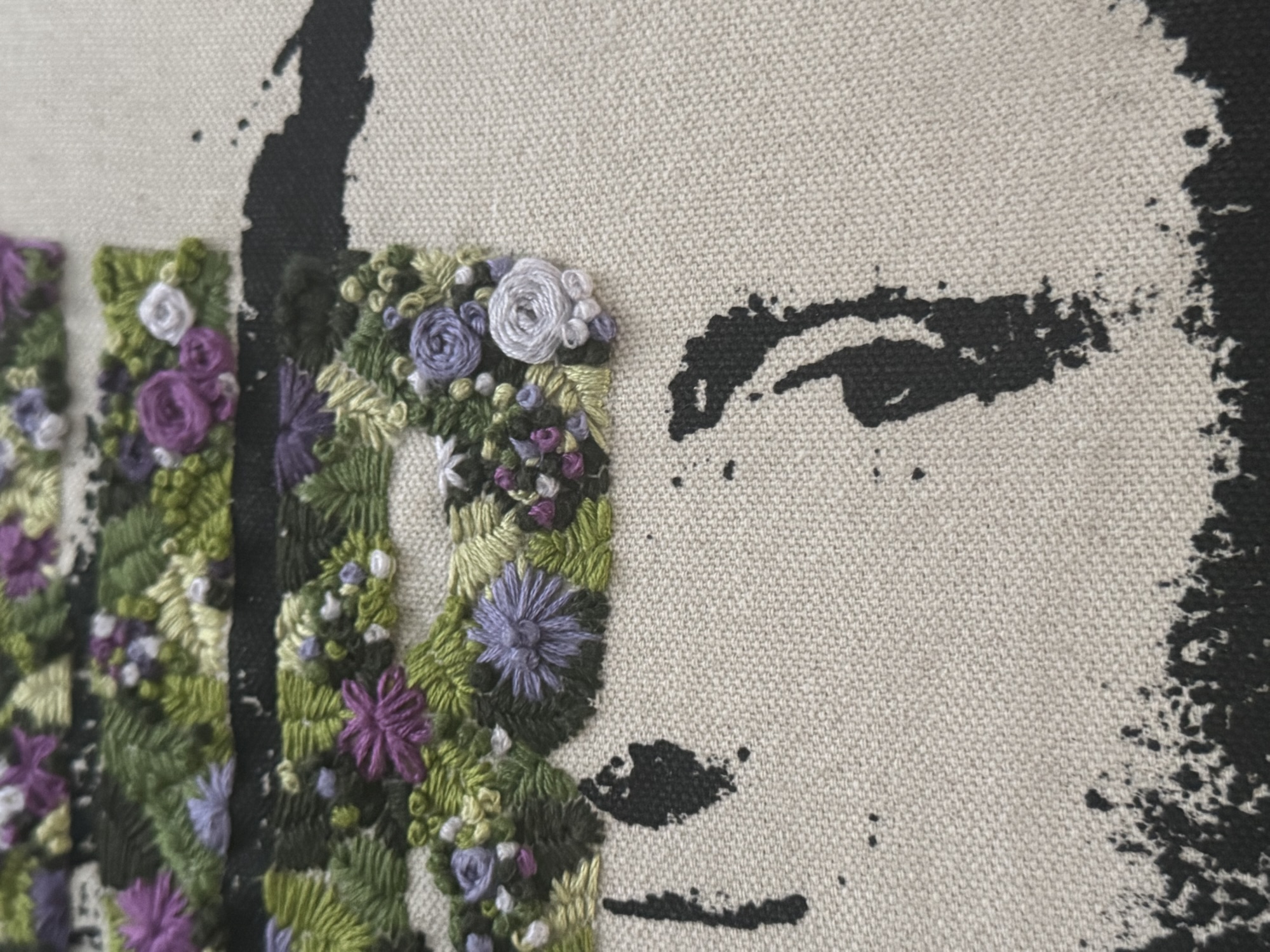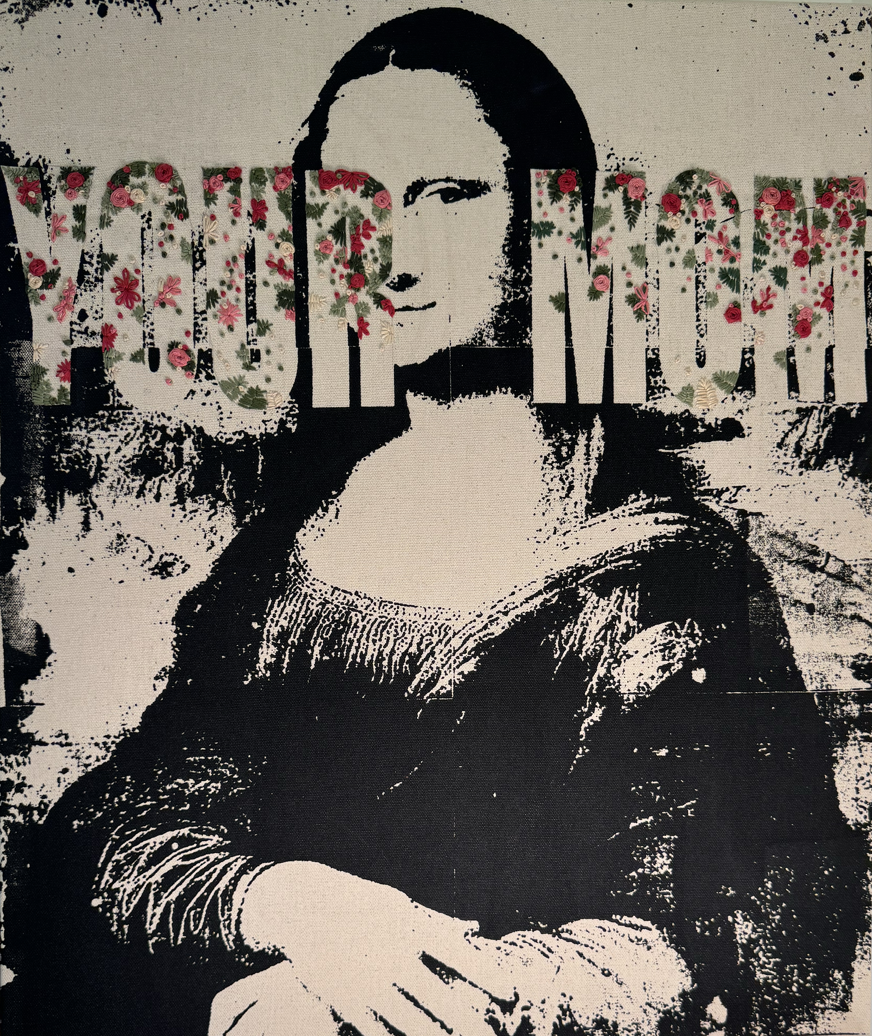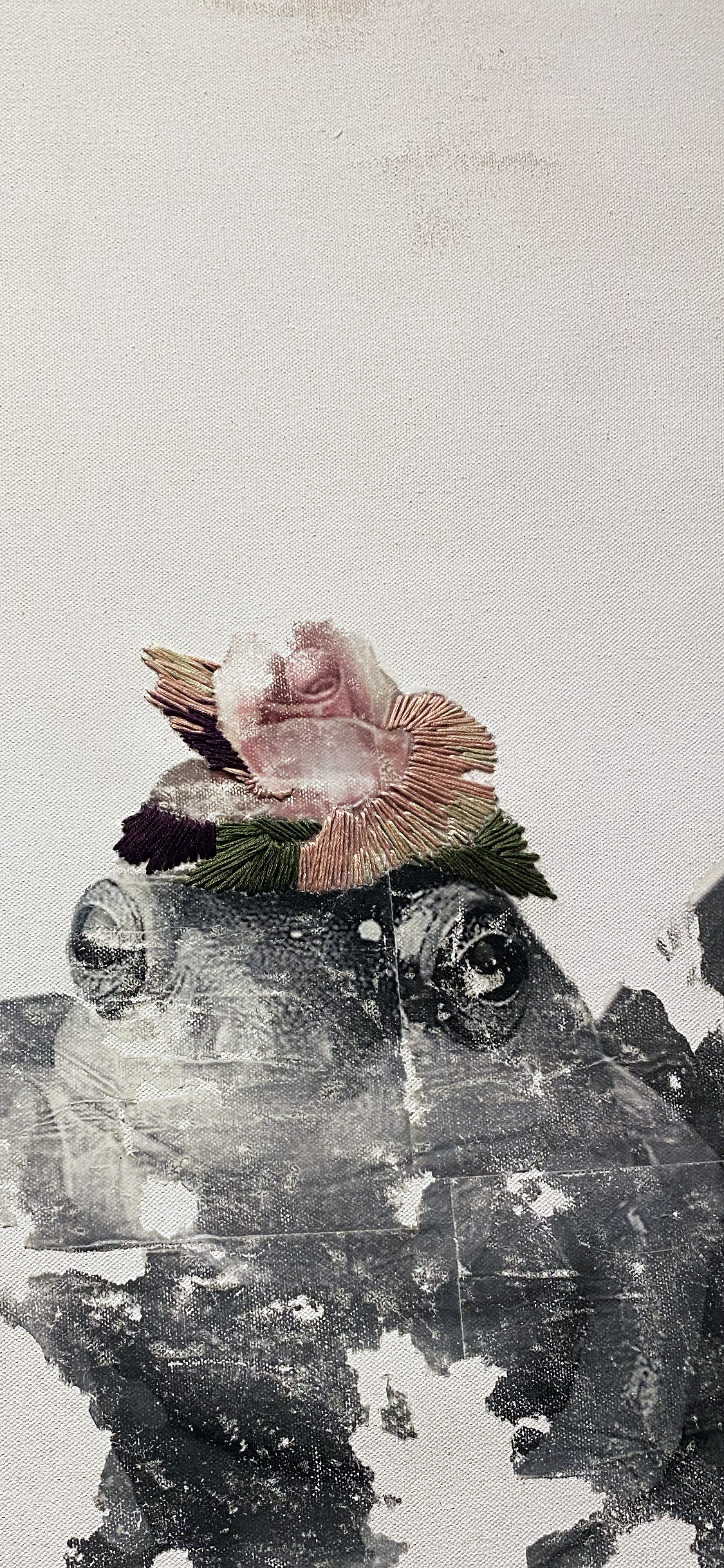 Your Mom I and Your Mom II, Gel Medium Transfer, Embroidery Floss, under Acrylic Plexi, 2025.