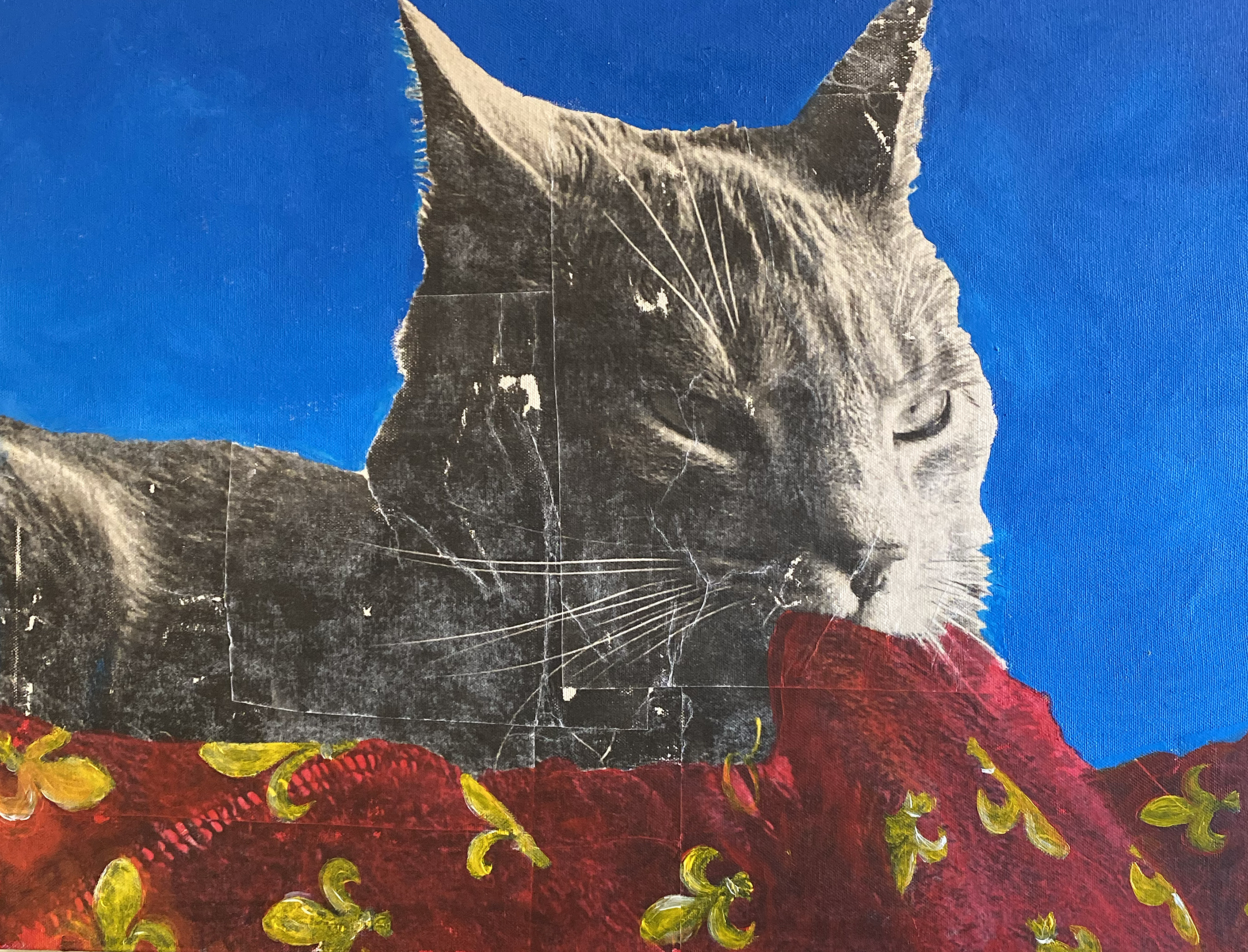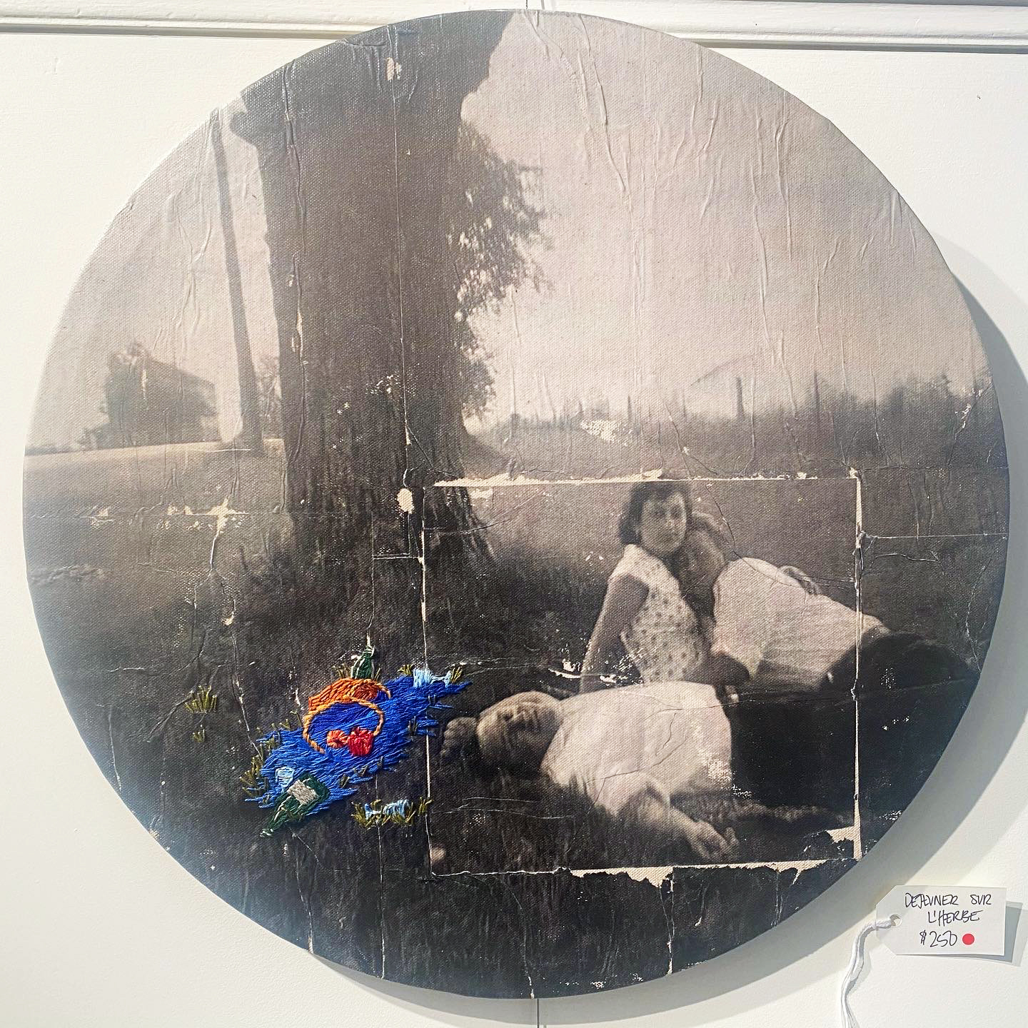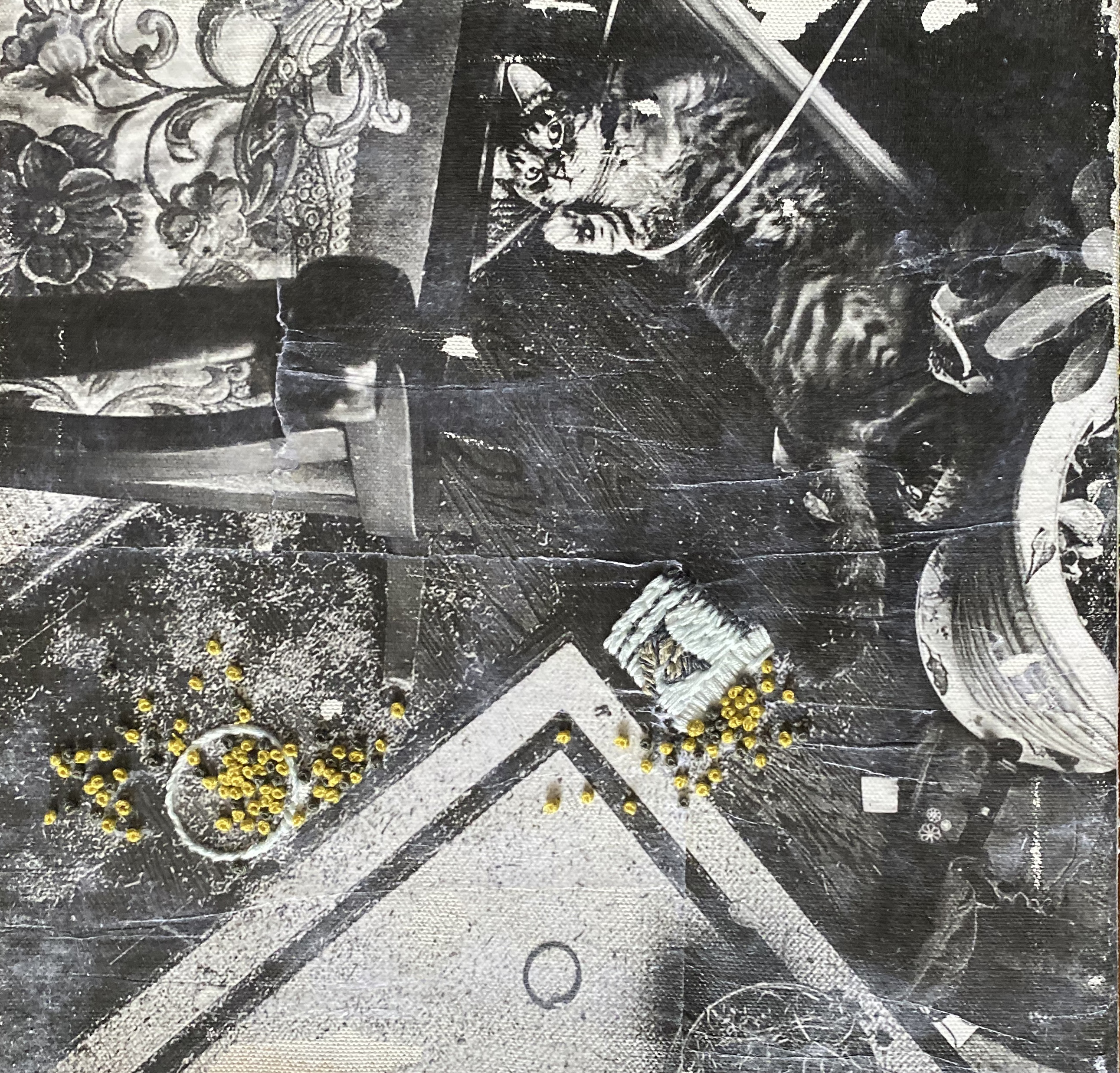 After the Parade. Gel Medium Transfer, Embroidery Floss, Acrylic Paint, Wood, 2024.