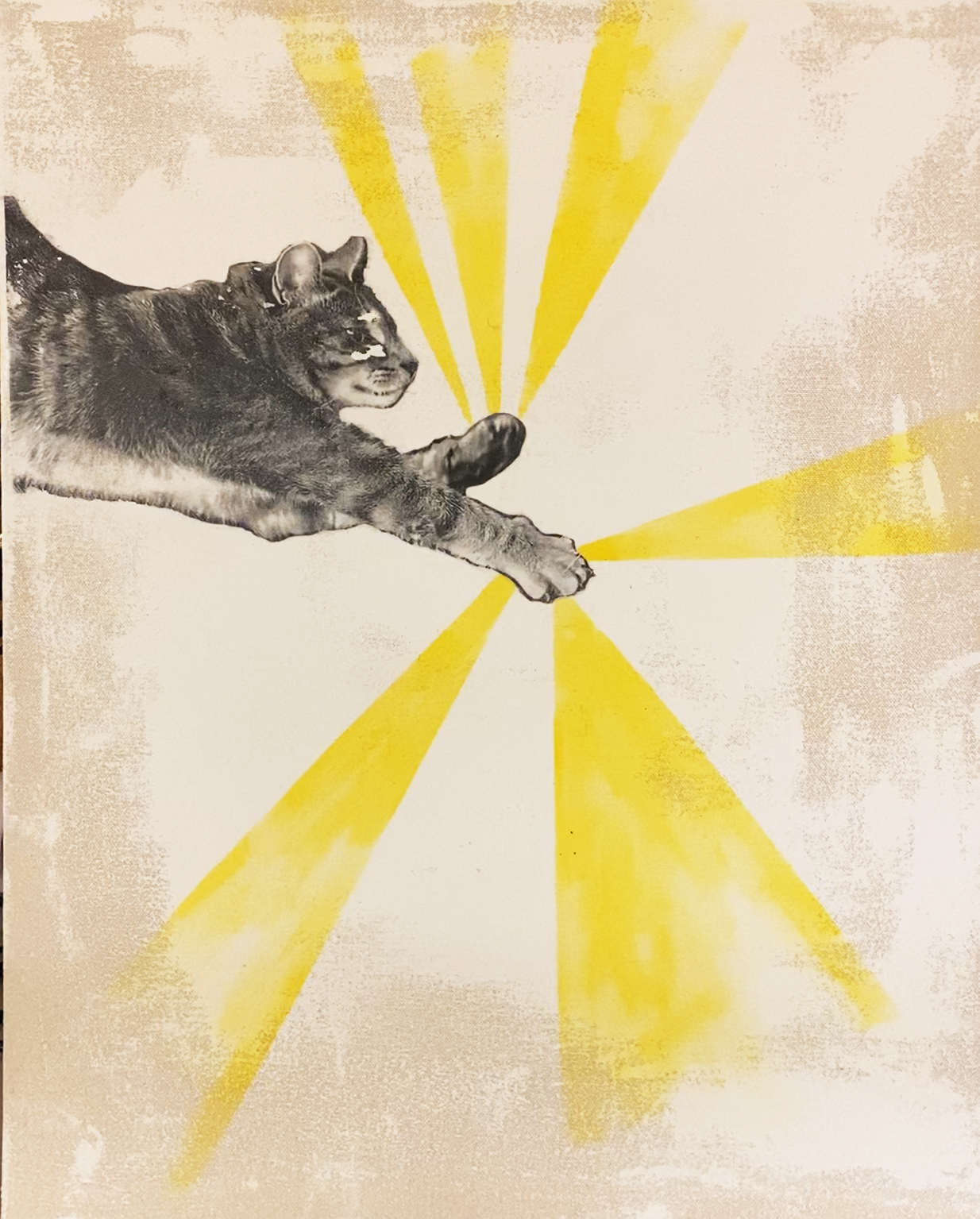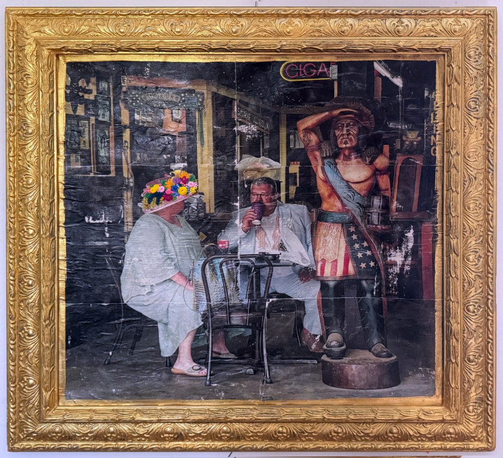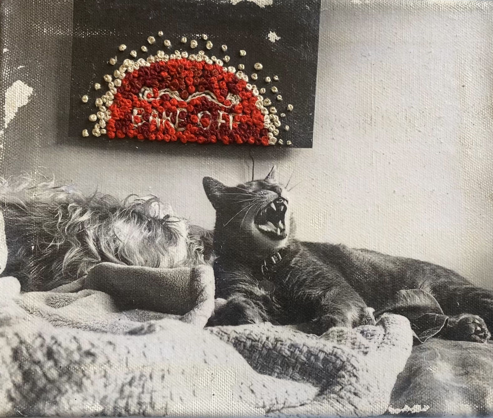 After the Parade. Gel Medium Transfer, Embroidery Floss, Acrylic Paint, Wood, 2024.